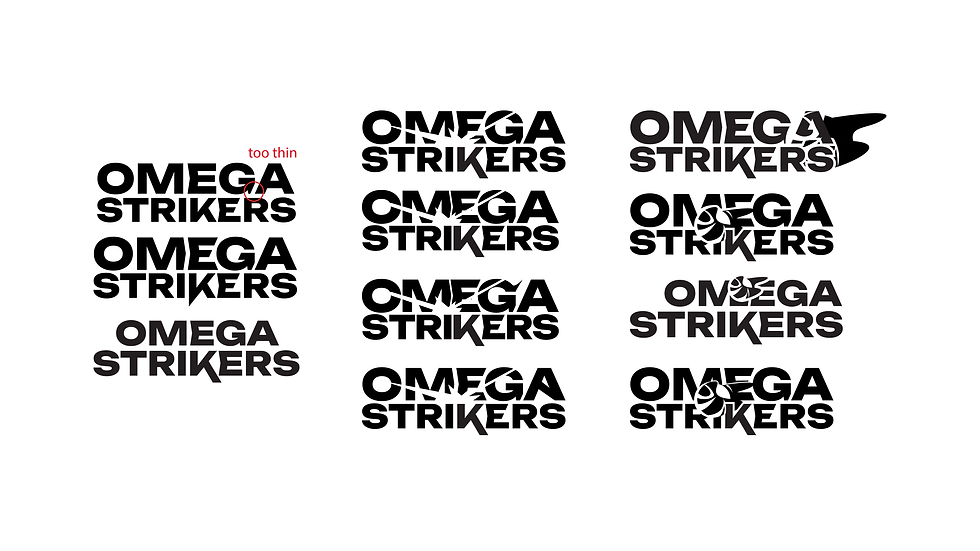 After establishing my letterforms, I wanted to bring the Core into my logo. I experimented with depicting the Core differently from the original Omega Strikers logo. I wanted to express more motion, while still keeping a similar silhouette. However, in the end, the team and I decided the simplified logo that focused on the movement or trail of the Core was more effective.